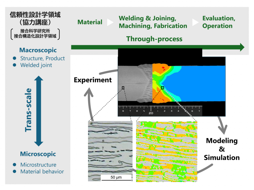 Development of innovative manufacturing technology is required to manufacture high-performance machine products and structures of the next-generation. Department of Reliability Evaluation & Simulation conducts research and education for elucidation and control of the factors on weldment properties by high accurate evaluation based on material science and engineering. In order to create innovative and attractive technique of welding & Joining as a final aim, our department are working on elucidation of metallurgical phenomenon such as solidification and transformation, and on developing the predication method for the microstructures and the properties of weldments.