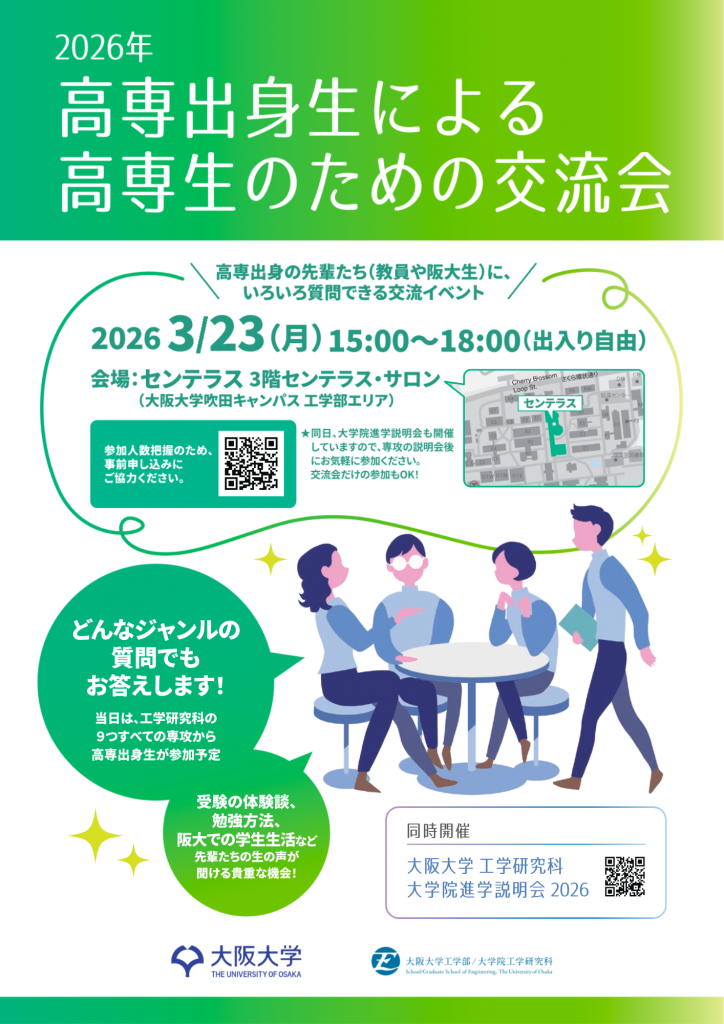 本交流会は、高専出身の本研究科在籍の学生と高専生がフリートークを行うもので、阪大工学研究科生と直接話ができる貴重な機会となっております。