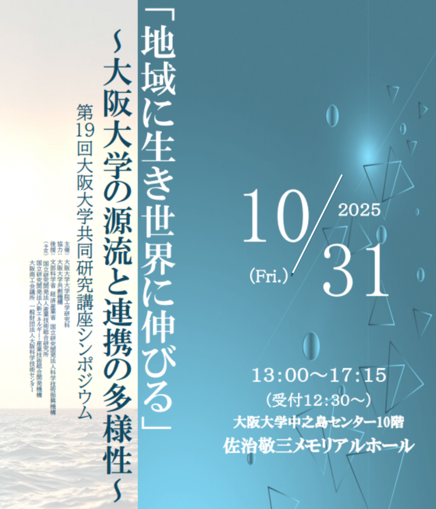10月31日(金)、大阪大学中之島センターに於いて第19回大阪大学共同研究講座シンポジウム「地域に生き世界に伸びる」~大阪大学の源流と連携の多様性~を開催いたします。