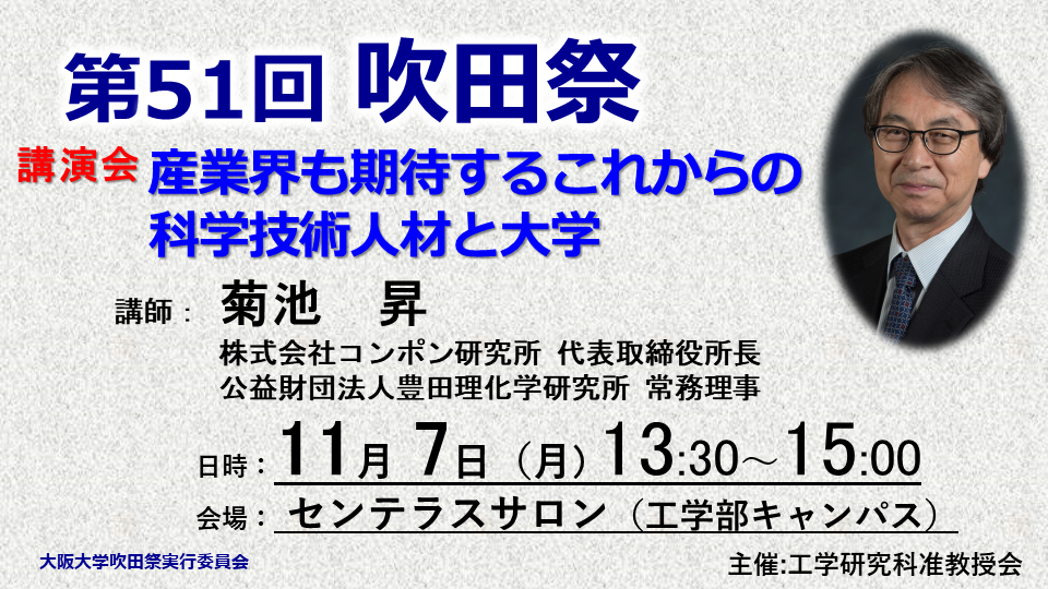 問い合わせ先:吹田祭事務局 大道徹太郎(Tel:06-6879-7458・Mail:ohmichi@mat.eng.osaka-u.ac.jp)