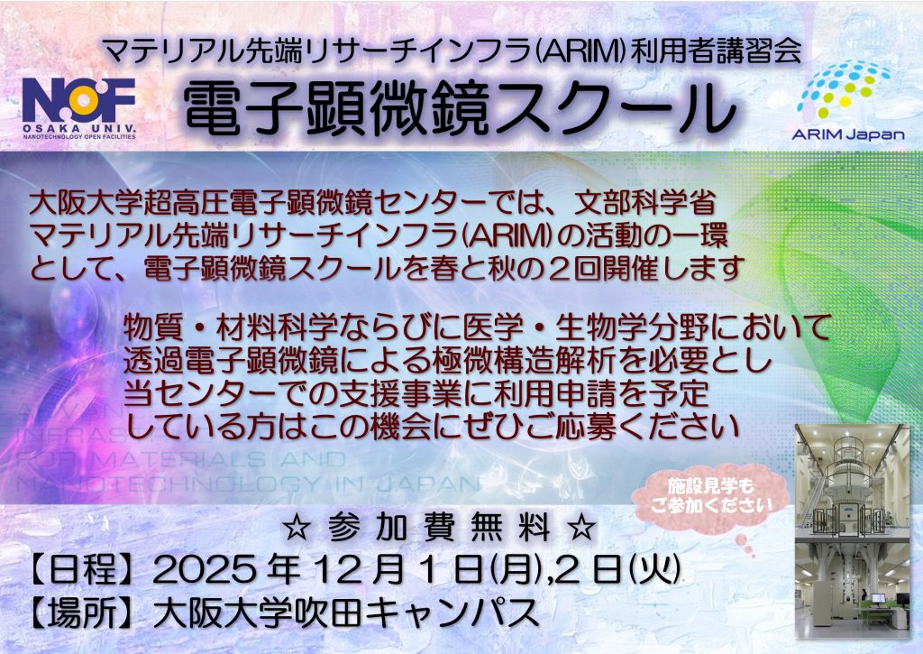 大阪大学超高圧電子顕微鏡センターでは、文部科学省マテリアル先端リサーチインフラ(ARIM)の活動の一環として、電子顕微鏡スクール(利用者講習会)を春と秋の2回、開催しております。