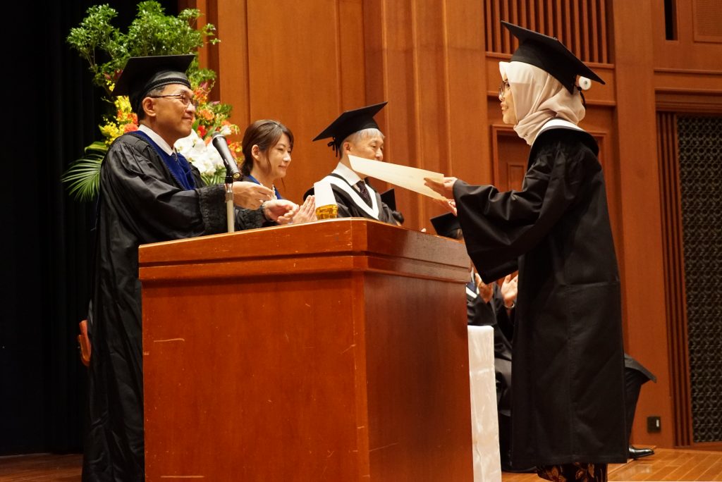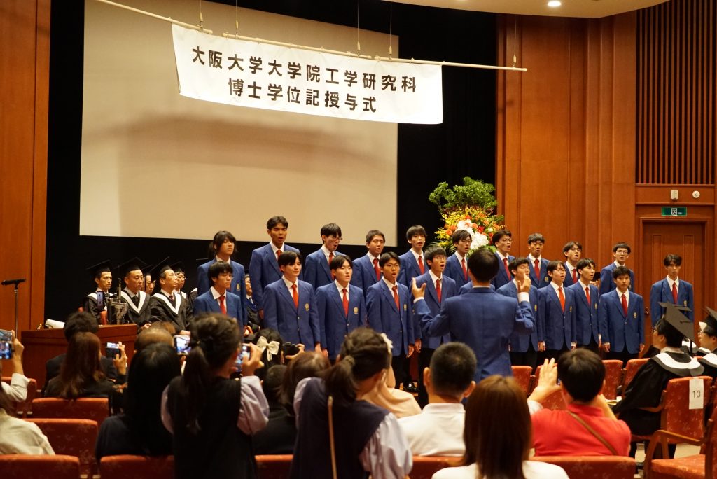 当日は、大政健史研究科長から修了生一人一人へ学位記が授与されました。男声合唱団によるお祝いの斉唱が披露されるなど、厳かな雰囲気もありながら、終始和やかに式典が執り行われました。