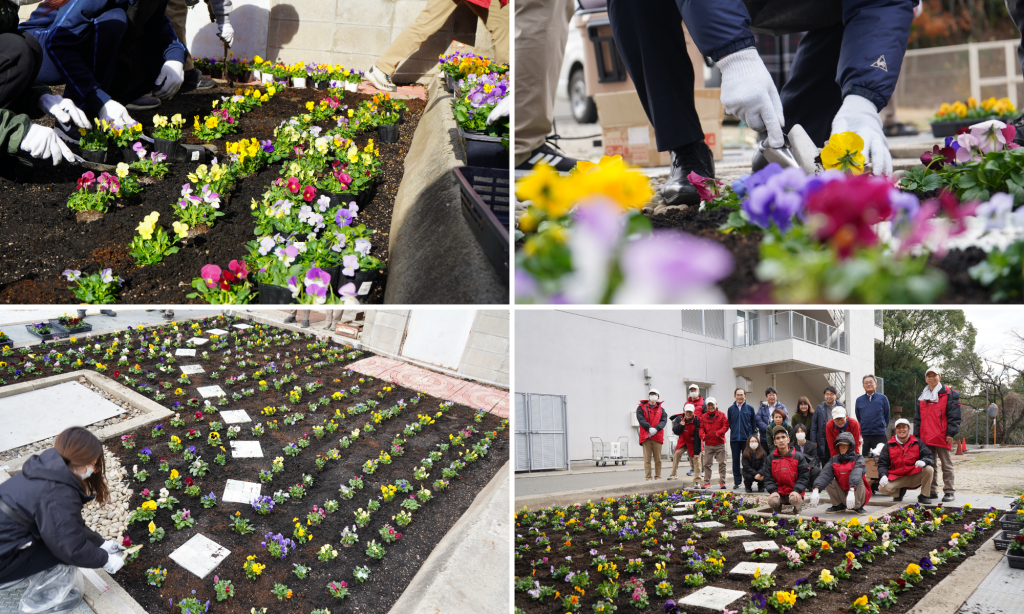 後半の12月22日(月)は、前半で作った砂利敷きの隣に花壇を作りました。様々な色のビオラやパンジーがバランスよく配置され、工学部キャンパスにカラフルな空間が加わりました。