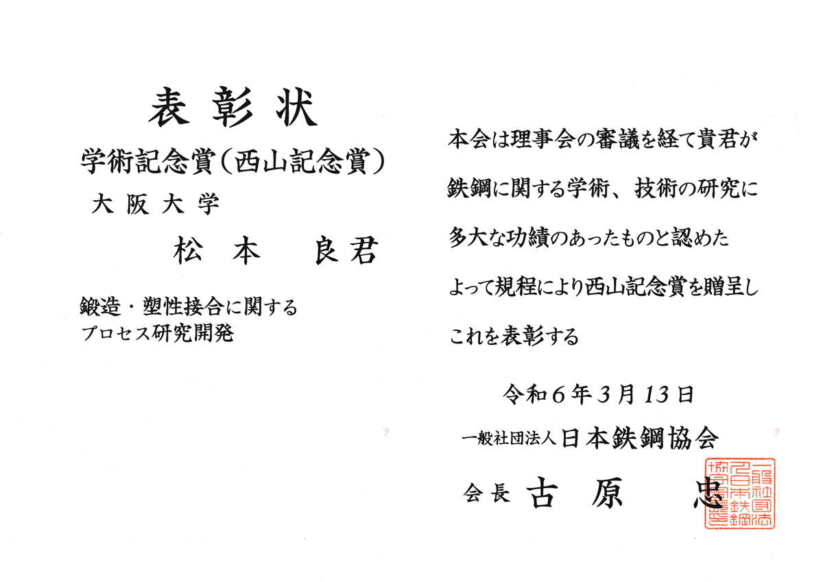 研究成果 松本 良 准教授が「日本鉄鋼協会 西山記念賞」を受賞