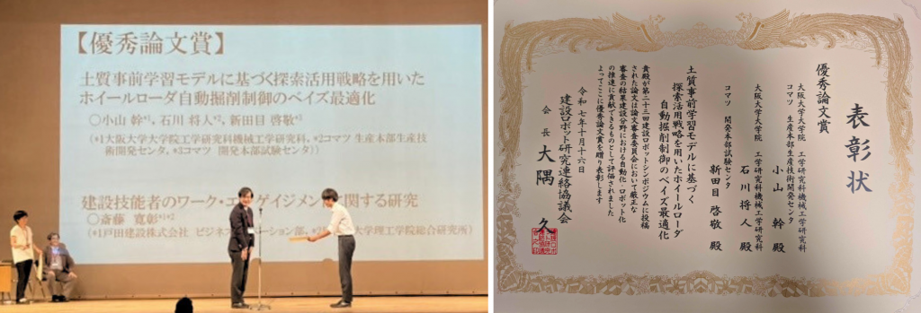 受賞題目:「土質事前学習モデルに基づく探索活用戦略を用いたホイールローダ自動掘削制御のベイズ最適化」
