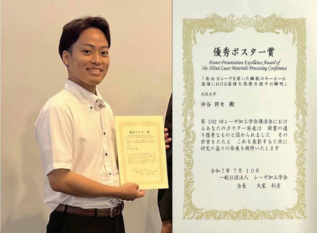 また、仲谷さんは、2025年7月に行われた第102回レーザ加工学会講演会においても、優秀ポスター賞を受賞しています。