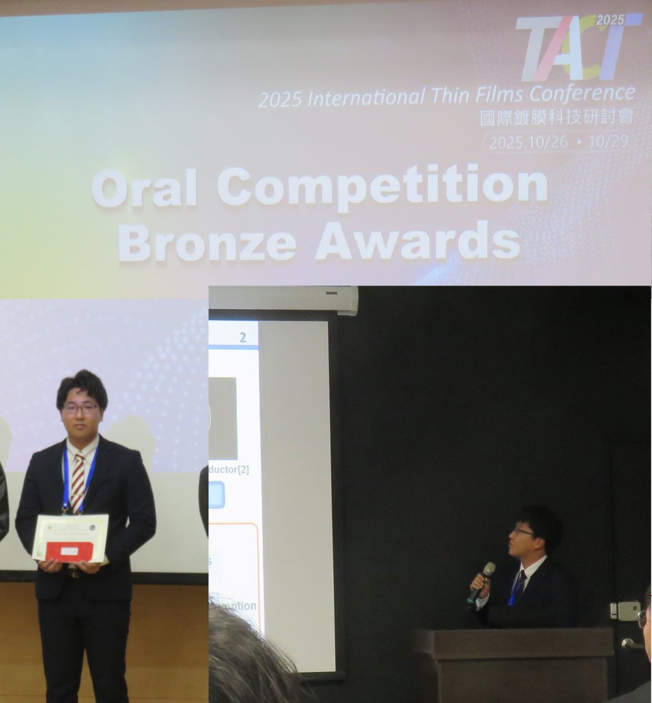 物理学系専攻(精密工学コース)博士前期課程の樋口瑠洸さんが、「薄膜に関する国際会議(TACT2025)」において、Bronze Awardを受賞しました。