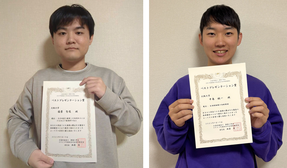 機械工学専攻博士前期課程(榎本・杉原研究室)の稲葉智哉さんと中島駿一さんが、2025年度精密工学会 秋季大会学術講演会でベストプレゼンテーション賞を受賞しました。