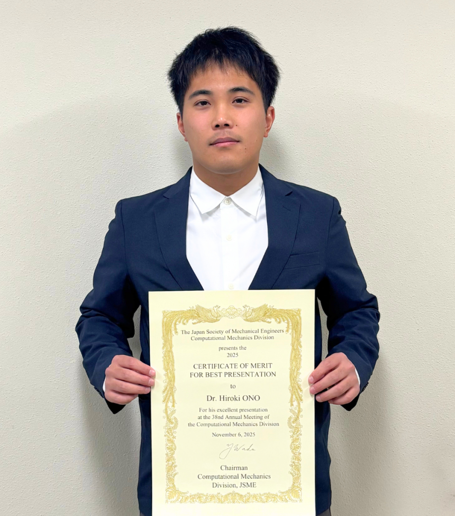 機械工学専攻 博士後期課程の小野弘貴さん(中谷・土井研究室)が、日本機械学会 第38回計算力学講演会(2025年9月24日~26日、信州大学)において優秀講演賞を受賞しました。