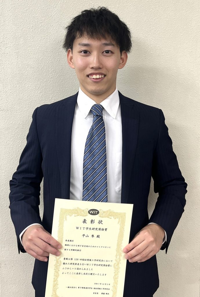 機械工学専攻 博士前期課程の平山隼さんが、電子情報通信学会 福祉情報工学研究会でWIT学生研究奨励賞を受賞しました。