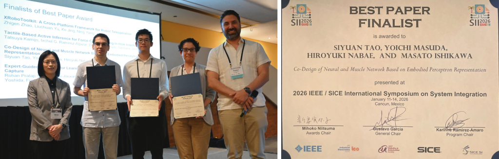 機械工学専攻 博士前期課程の陶 斯遠さん、増田容一助教、石川将人教授らの研究チームが、The 2026 IEEE/SICE International Symposium on System Integration (SII 2026)でBest Paper Finalistを受賞しました。