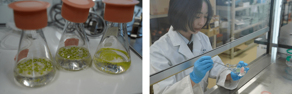 (右)実験室でウキクサをあつかう杉山さん
