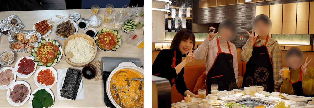 (左)池研究室で開催した手料理パーティー(手巻き寿司、インドネシア料理、中国料理など)。美味しかった!