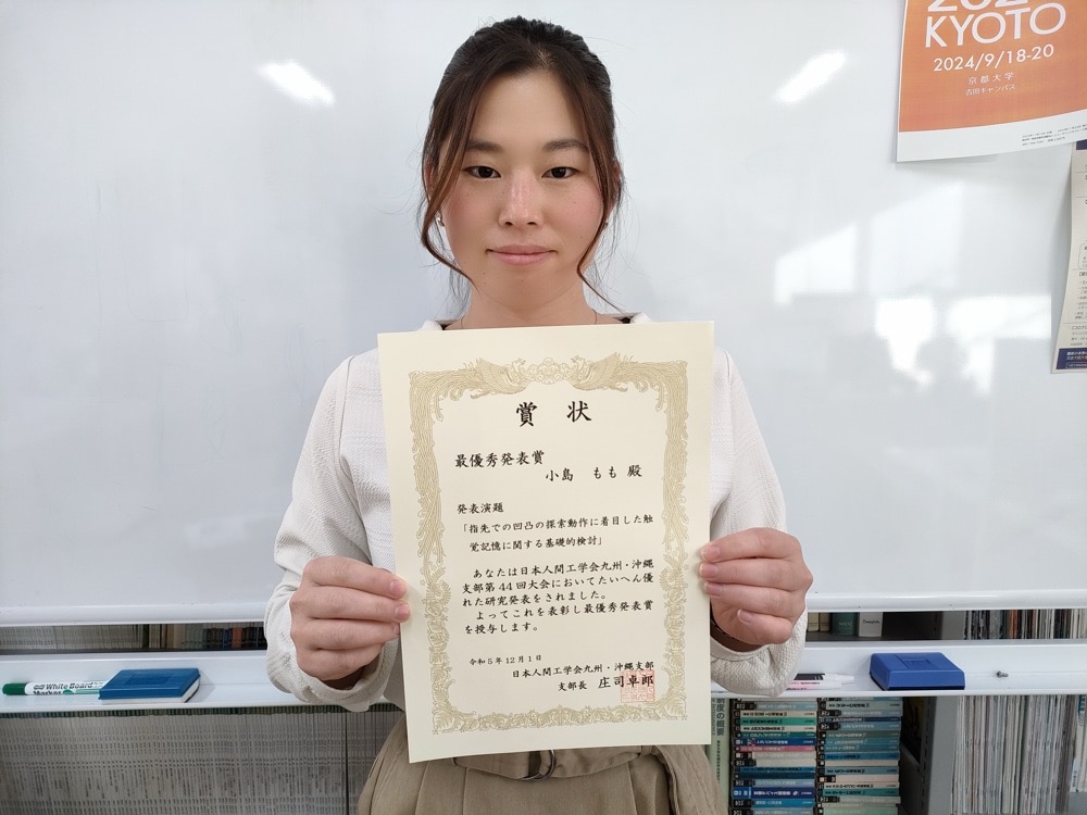 大学院では、メンタルヘルスに関わるデバイスを開発したいと思い、井野研究室で触覚の研究を行っていました。触覚は質感の知覚だけでなく、情動へ働きかける作用もあり、集中力やリラックス効果を高めることもできます。このような背景から、触覚感覚の呈示方法について検討する中で、指先触覚感覚の識別能に興味が湧き、触覚感覚がどれくらい記憶に残り、テクスチャ(物体の表面の質感)の識別に影響するかを研究しました。研究室の1期生で先輩がいなかったので、修士論文を書く際には、社会意義や研究背景をいちから考える必要があり、卒業論文以上に大変でしたが、先生方からのアドバイスや同期同士でお互いの論文を添削しながら、なんとか書き上げることができました。研究活動の集大成として発表した修士論文が、日本人間工学会の九州・沖縄大会で「最優秀発表賞」を受賞することができ、とても嬉しかったです。