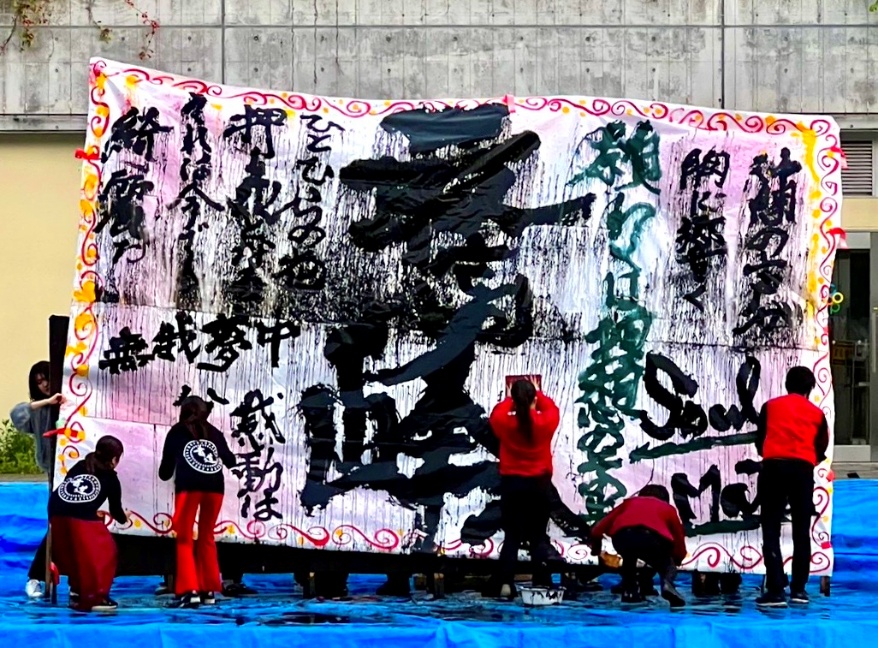 大学祭でのパフォーマンス風景。写真の文字は「最高峰」。Ado の曲「私は最強」に合わせてパフォーマンスしました。本番当日はあいにくの雨で墨が垂れてしまっていますが、今となっては、それもいい思い出です。