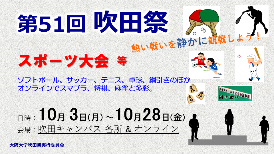 今回で51回目にあたる吹田祭を開催するにあたり、すっかり定着した学生主導の10月のスポーツ大会、第33回演奏会(10/30)、工学研究科准教授会による講演会(11/7)を存分にお楽しみ下さい。