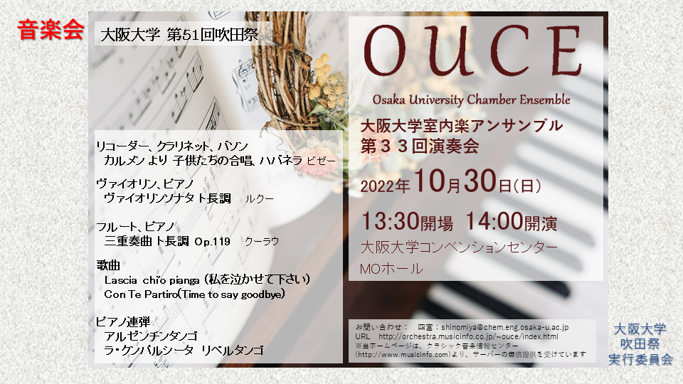 問い合わせ先:吹田祭事務局 大道徹太郎(Tel:06-6879-7458・Mail:ohmichi@mat.eng.osaka-u.ac.jp)